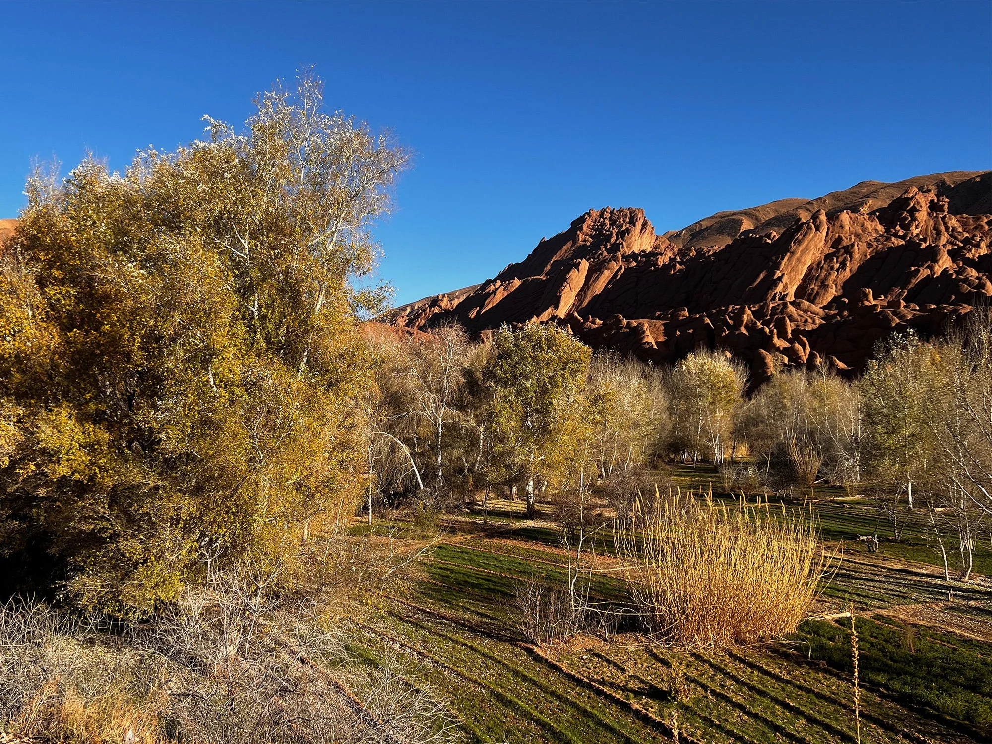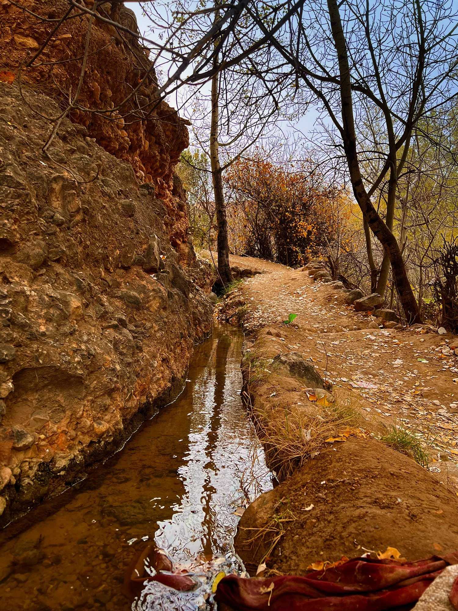 Stepping from our door, we drop into the trees and wander alongside the irrigation channels. We are immediately captivated by this cultivated land's colours, textures and patterns and bird songs. Looking up from the valley floor the village's houses blend seamlessly with the hillside above, which is not surprising when you realise that they are built using the same earth and rock.